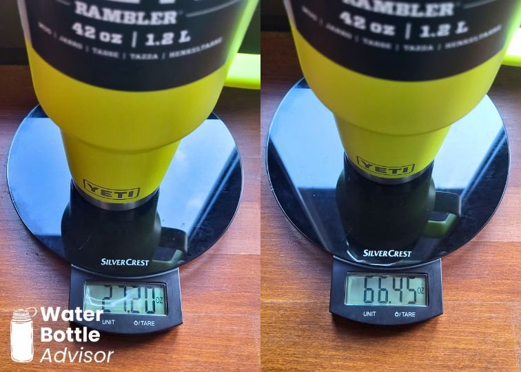 I own a few YETI Ramblers (both bottles and tumblers) and the first thing that comes to mind when I pick them up is just how heavy they are. My 42 oz Rambler tumbler weighs 27.2 ounces when empty (the 35 oz size weighs 24 oz), and once it’s filled, it tips the scale at more than 66 ounces. That’s over four pounds in your hand.