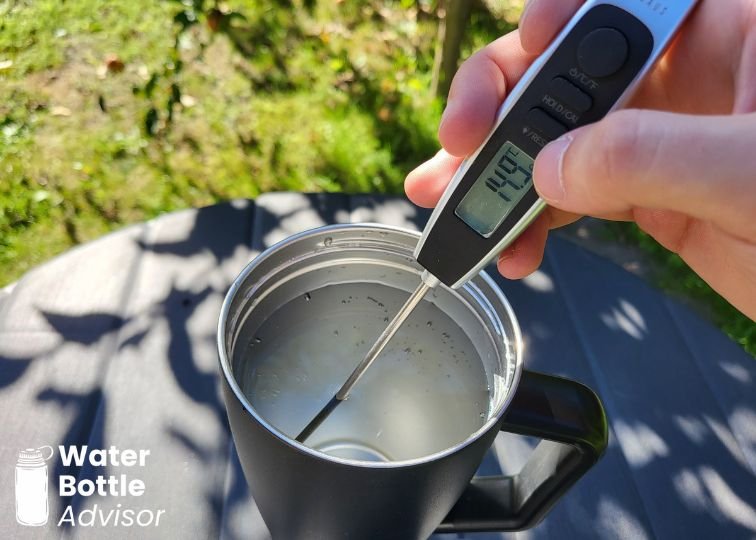 The YETI Rambler turned in a nearly identical performance. After 14 hours, the water measured 15.3 °C (59.5 °F). The only difference is that I started closer to freezing at 0.2 °C (32.4 °F), so in relative terms BrüMate pulled slightly ahead.