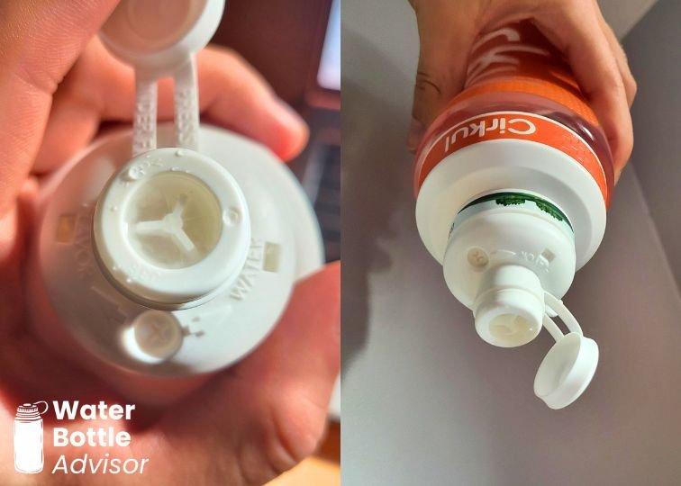 The lid has a few other neat tricks too. Inside the spout is a thin membrane that acts like a one-way valve. You can turn the bottle upside down with the cap open and not a single drop escapes, unless you squeeze the bottle, in which case the water flows freely. It’s a rare and useful feature that I spotted only in two other bottles I own.