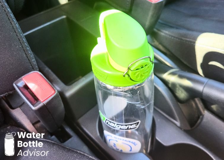 Nalgene markets the 16 oz. size as “perfect for car rides”. I’ll politely disagree. With a diameter of over 3 inches, it doesn’t fit in my car’s cup holder, and I’m not about to juggle a bottle while driving.