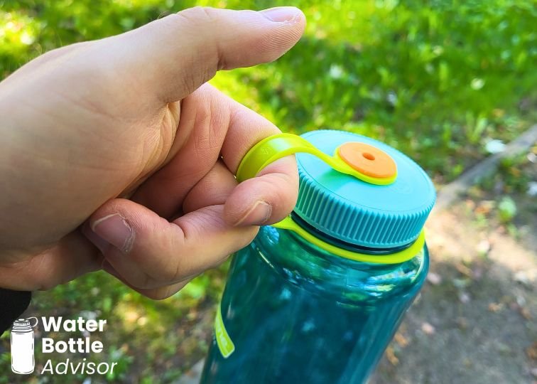 It clicks shut securely, and there’s even a locking pin to prevent accidental button presses. The only downside? This particular cap is made in China, unlike Nalgene’s standard caps that are proudly made in the USA.